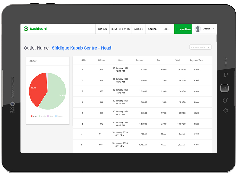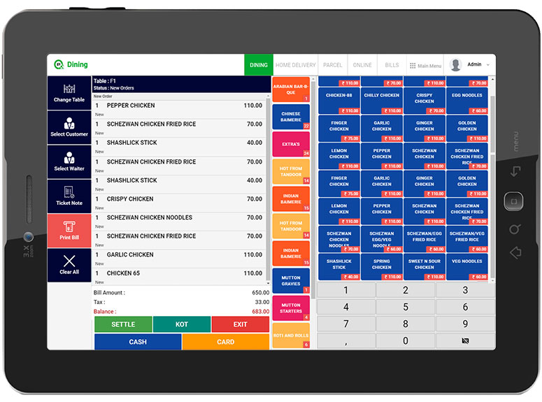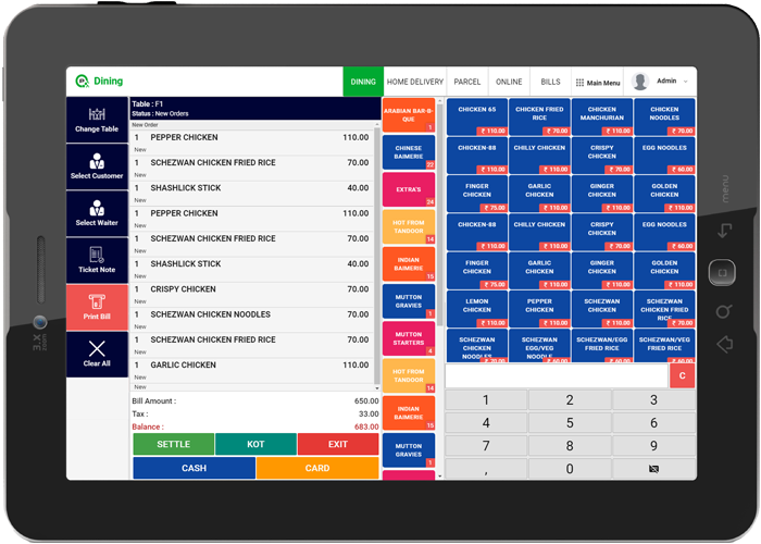 Settle via multiple payment options such as cash, cheque, debit/credit card, loyalty card, customer account. Add discount on receipt and menu item or menu group. Define various tax type.